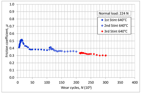 Different test rigs [21,23,24] were used to measure the friction coefficient. Specimens were covered with the same coating—applied with the same technological process—of the dummy blade. The contact surfaces of two specimens were provided in the same roughness condition as dummies. Experimental procedures and methodologies used are reported in [22]. Figure 8 shows the friction coefficient measured with flat-on-flat contact surfaces using the test rig described in [23,24]. The diagram shows the friction coefficient as a function of wear cycles. Results were recorded during three different measurement sessions, namely the 1st, 2nd and 3rd Stints. Between two stints, specimens were removed and cleaned. Discontinuity in the friction coefficient between two consecutive stints are due to the debris entrapped between the mating surfaces as explained in [21].