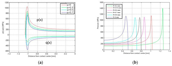 The state of stress was computed first on a rounded punch, as shown in Figure 4. This computation was performed with the analytical the model at the maximum load of 20 kN. The rounded punch is composed of a flat base of width 2a and two arcs whose radius is R (fillet radius). The rounded punch is symmetrical, and so only half of the contact region is depicted in Figure 9. Figure 9a illustrates the distribution of normal (p(x)) and tangential (q(x)) contact stress along the contact line for different values of the friction coefficients μ. The tangential stress q has been determined in full sliding conditions. The fillet radius is R = 0.45 mm and corresponds to the outer radius at the edge of the bedding in the dovetail. Figure 9a shows that the contact pressure increases dramatically at the end of the contact where the fillet connects to the flat base. Figure 9b reports the normal pressure along the contact line for different fillet radii R. This analysis was made assuming a constant overall dimension of the punch. In other words, the distance between the endpoints of the two arcs, namely 2·(a + R), remains constant. Figure 9b shows that there is an optimum radius R = 0.7 mm for which the contact pressure reaches a minimum.