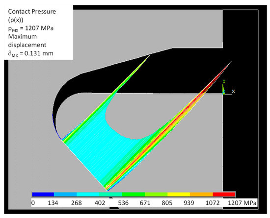 Figure 10 reports the normal contact stress calculated by the FE model. It can be observed that the higher peak contact stresses are located at the lower radius, i.e., the outer edge of the bedding. The effect of the different radii (inner and outer) is quantified. The higher peak was also predicted with the analytical model and there is a good agreement between the numerical and analytical models. The peak contact stresses is located at outer edge of the bedding and its value (1206 MPa) is very near to the prediction of the analytical model (about 1150 MPa), see Figure 9b at R = 0.45 mm. The difference between the numerical and analytical models is mainly due to the compliance of the disk (the analytical model neglects this effect). Moreover, these pressure distributions are even coherent with results obtained by the model [25] based on a different methodological approach.