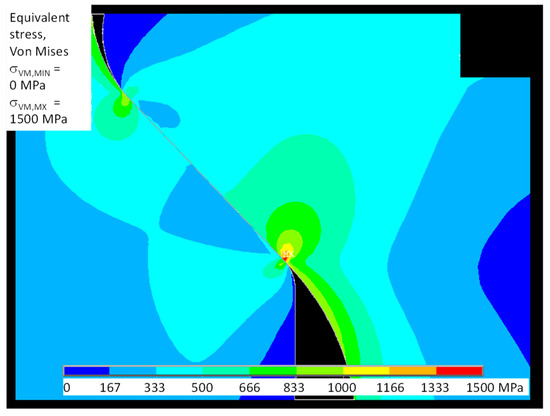 Figure 11 shows the spatial distribution of Von Mises stress; this failure criterion is important for analyzing the ductile behavior of the dummy disk (Inconel 718). Figure 12 shows the principal stress distribution σ1, σ3 more appropriate to the brittle behavior of the dummy blade (γTiAl). Figures also highlight how the maximum stress is located at the contact between the external end of the disk slot and the dummy blade root.