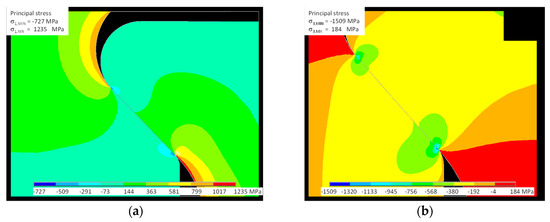 FE model of test # 2: (a) principal stress σ1; (b) principal stress σ3.