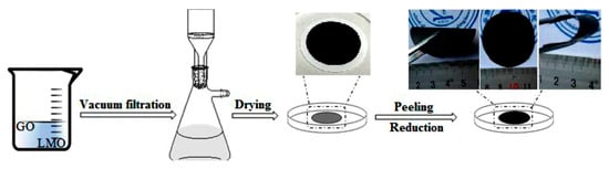 The flexible LiMn2O4-graphene film was manufactured by an ordinary vacuum filtration method followed by a thermal reduction process. Typically, 30 mg GO was dispersed in 10 mL deionized water and underwent ultrasonic operation for 2 h to a uniform brown GO suspension. 20 mg LiMn2O4 powder was secondly dispersed into the GO suspension to undergo ultrasonic treatment for 2 h. The suspension was then filtered through a filter membrane under vacuum. The flexible film was peeled off carefully from the membrane after washing, drying and immersing in acetone for 15 min. After being heat treated in air at 220 °C for 2 h to reduce GO into graphene (GN), the final flexible LiMn2O4-graphene film was obtained, labeled as LMO/GN-F. The preparation procedure and photos of the flexible film are shown in Figure 1. For comparison, the LiMn2O4-graphene powder (LMO/GN-P) was prepared by simple physical ball-milling.