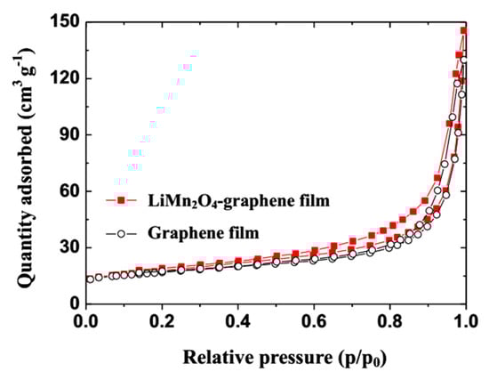 The N2 isotherm adsorption and desorption curves of the graphene film and the LiMn2O4-graphene film.