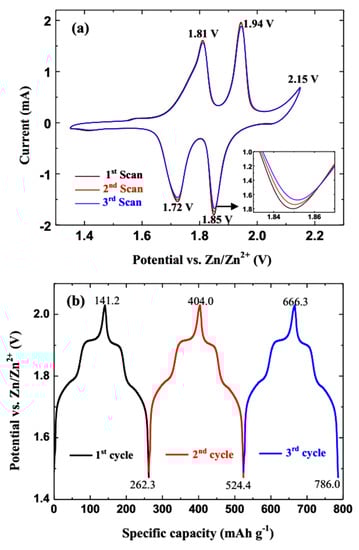 The cyclic voltammetry (CV) was carried out on a CHI 660D electrochemical workstation at a scan rate of 0.15 mV s−1 in the potential range of 1.35–2.15 V vs. Zn/Zn2+. The galvanostatic charge-discharge tests were arranged on a LAND battery program-controlled tester in a cut-off potential window of 1.45–2.05 V. Electrochemical impedance spectroscopy (EIS) was performed by using the CHI 660D electrochemical workstation with a frequency range from 0.01 to 100 kHz.