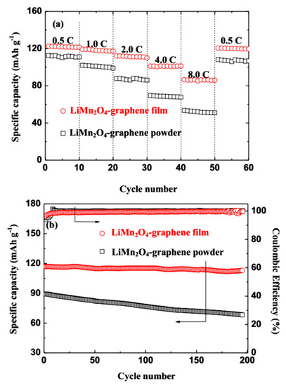 Rate capability (a) and cycle performance at 1C (b) of the LiMn2O4-graphene powder and LiMn2O4-graphene film cathodes.