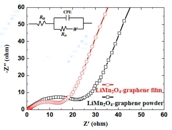 Benefitting from the vacuum filtration method, the LMO nanowires and graphene sheets in LMO/GN-F contact each other more closely than in LMO/GN-P prepared by simple physical mixing. The improvement of electrochemical performance is mainly attributed to the positive effects of graphene in enhancing electronic conductivity [], decreasing the LMO nanowires agglomeration and handling the volume expansion of LMO during charge-discharge cycles. The positive influence of the LMO/GN-F electrode on charge transfer behavior and conductivity of the system can be proved by the EIS measurements (Figure 8). As shown in Figure 8, both impedance plots of the LMO/GN-P and LMO/GN-F electrodes have the similar shape, which is composed of a semicircle in the high-to-medium frequency and a straight line in the low frequency. The slope angle of the straight line in the low-frequency region of the LMO/GN-F electrode is larger than that of the LMO/GN-P electrode, demonstrating that the LMO/GN-F electrode has a smaller Warburg impedance (W), resembling the solid-state diffusion of within the electrode [,]. The diameter of the semicircle in the high- to medium-frequency region for LMO/GN-F electrode is about 15 Ω, which is significantly smaller than that of the LMO/GN-P electrode (about 25 Ω), indicating that the LMO/GN-F electrode has a lower charge-transfer resistance (Rct) at the electrode/electrolyte interface. The equivalent circuits are inset in Figure 8. In addition to W and Rct, discussed above, RΩ is the ohmic resistance representing the total resistance of the electrolyte, separator, and electrical contacts. CPE is the constant phase-angle element, involving double layer capacitance of the active materials. The enhancement of charge transfer and Li+ diffusion in combination with the lower aggregation of LiMn2O4 nanowires and the better volume change handling could lead to the superior electrochemical performance of the LMO/GN flexible film.
