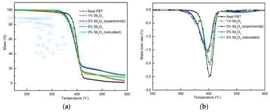 The thermal degradation behaviors of the neat PBT and its composites were investigated by TGA in N2. The mass loss and mass loss rate curves of the neat PBT and its composites are displayed in Figure 3, and the related data are summarized in Table 4. T10% was defined as the temperature at which the weight loss was 10 wt %. TPeak% was the maximum value of the weight loss. As we could see, the decomposition of the neat PBT and its composites could be divided into two stages: a fast decomposition stage and a stable carbon layer slow decomposition stage. The first stage occurred mainly between 330 and 430 °C. In this stage, the decomposition temperature range of the neat PBT matrix was narrow, concentrated at 370–430 °C, with a 10% weight loss that occurred at 372 °C, a maximum mass loss rate at 407 °C, and a weight loss as high as 91%. The initial decomposition temperature and peak heat release rate of PBT decreased after adding the nano-Sb2O3 flame retardant. This effect might be attributed to the catalytic effect of the metal oxide on the fragmentation of the macromolecule chain [30], which promoted the rapid oxidation of PBT. This demonstrated that an interaction between the flame retardant and PBT promoted the flame-retardant composites to degrade at lower temperatures, resulting in some high-quality residual char layer.