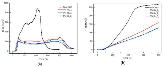 HRR, PHRR, and THR are very important parameters to evaluate the combustion performance of polymers, which could be used to predict the transferring speed of flame and fire size. As shown in Figure 4a,b and Table 5, the HRR rose rapidly when the neat PBT had been burnt and decreased rapidly after the vertical displacement reached the peak (917.5 kW/m2). By increasing the amount of the nano-Sb2O3 flame retardant, the value of HRR and THR showed an obvious decrease for the nanocomposites. When the content of the nano-Sb2O3 flame retardant exceeded 3 wt %, the HRR value did not change much. The HRR, PHRR, and THR of the neat PBT were 375.1 kW/m2, 917.5 kW/m2, and 265.6 kW/m2, respectively. The amount of flame retardants added to nano-Sb2O3 was 1 wt %, 3 wt %, and 5 wt %. In these conditions, HRR, PHRR, and THR were significantly reduced, with maximum decreases of 57.6%, 75.5%, and 43.7%. This showed that nano-Sb2O3 could reduce the release of heat during the combustion process of the composite materials. As shown in Figure 5, nano-Sb2O3 promoted the formation of a protective carbon layer on the surface of the composite in the combustion process. The formation of a carbon layer prevented heat transfer and flame transmission to a certain extent [32], retarded the combustion of the bottom polymer, inhibited the growth of HRR and THR, and extended the combustion time. In addition, as can be seen from Figure 4b, the curve inclination rate of THR decreased, which indicates that that fire spread rate could be reduced by the addition of nano-Sb2O3.