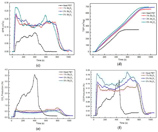 SPR and TSP are also important parameters when evaluating flame retardancy [33]. As shown in Figure 4c,d and Table 5, the SPR and TSP peak values were significantly higher after adding nano-Sb2O3. The SPR and TSP peak values of the neat PBT were 0.073 m2/s and 342 m2/kg, respectively. Adding different nano-Sb2O3 contents of 1 wt %, 3 wt %, and 5 wt %, the peak values of SPR were 0.21 m2/s, 0.241 m2/s, and 0.33 m2/s, and the peak values of TSP were 662 m2/kg, 691 m2/kg, and 698 m2/kg. This indicated that the addition of nano-Sb2O3 could inhibit the release of heat and increase the flue gas release. This was due to gas phase flame retardancy and solid phase flame retardancy produced by the bromine–antimony synergistic flame retardant, further preventing air from entering the surface of the specimens. Heat and mass transfer between polymer and heat source were limited, which resulted in incomplete combustion of the bottom polymer. This was also the main reason for the increase of smoke production.