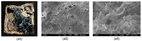 In order to investigate the flame retardant mechanism, the structures of these residues were characterized by SEM coupled with EDX. The digital photographs and SEM images of the residues for the neat PBT and its composites are displayed in Figure 5. Here, Figure 5(a1–a3) were macroscopic feature, low and high magnification of SEM images after burning, respectively. Representing method in Figure 5b,c were same as 5a. As it could be seen from Figure 5, there appeared to be more solid chars left behind on the surface of the nanocomposites than on that of the neat PBT. This could be explained by the better carbonization effects of nano-Sb2O3 on the PBT matrix, in agreement with the TGA analysis and cone calorimeter tests. The EDX results of the residues for the neat PBT and its composites were summarized in Table 6. The residue samples of the neat PBT and the 1 wt % nano-Sb2O3 composites were primarily composed of C and O elements. The residues were only composed of C element when the content of nano-Sb2O3 were 3 wt % and 5 wt %. All composites were free of Sb element. This showed that Sb element decomposed from the composites participated in the gas-phase flame retardant action. The Br–Sb synergistic flame-retardancy system could effectively trap radicals in the carbonization reaction. Figure 5c,d showed that the composites residue was firmer, thicker, and more compact. The more compact carbon layer could effectively insulate the air and act as an effective barrier to prevent heat transfer, protecting the underlying materials from further burning [34], which effectively reduces the fire hazards.
