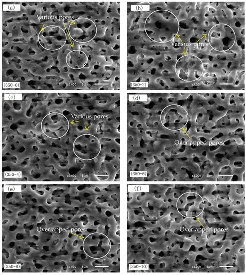 Surface morphology of micro-arc oxidation (MAO) coatings formed at pretreatment with different concentrations of Nd(NO3)3 solution: (a) 350–0, (b) 350–2, (c) 350–4, (d) 350–6, (e) 350–8, and (f) 350–10.