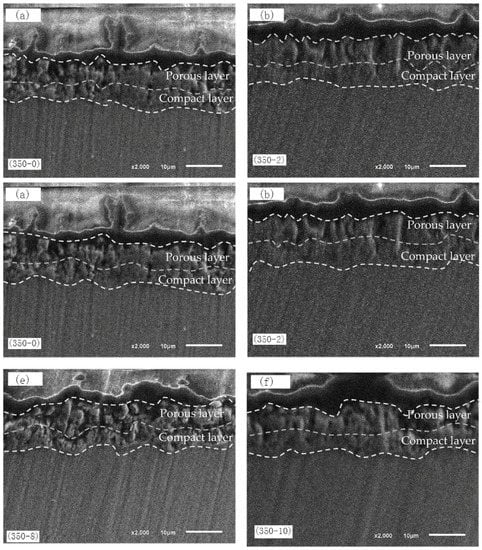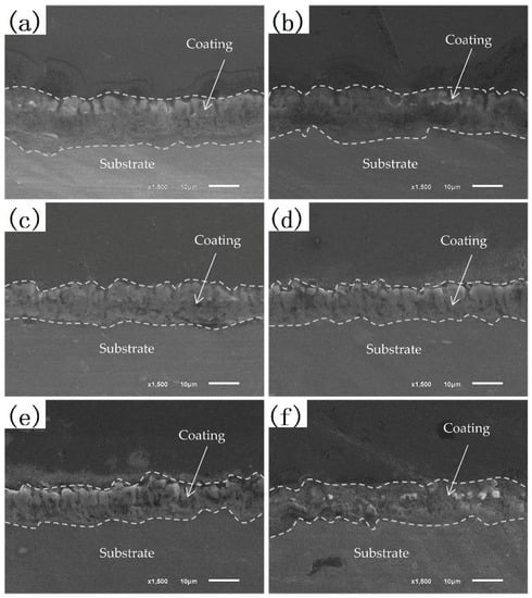 Cross-section morphology of MAO coatings formed at pretreatment with different concentrations of Nd(NO3)3 solution: (a) 350–0, (b) 350–2, (c) 350–4, (d) 350–6, (e) 350–8, and (f) 350–10.