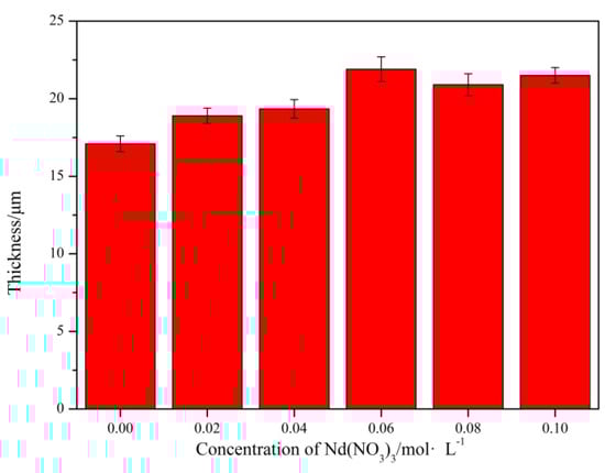 Figure 3 shows that the cross-section thickness exhibits an increase with the increase in the concentration of Nd(NO3)3 solution, and the concentration of Nd(NO3)3 increased to a certain value; the thickness does not increase any more. It can be observed that pretreatment with Nd(NO3)3 solution can increase the thickness of PEO coatings at a particular range. The optimal concentration for improving the film structure was 0.06 mol/L.