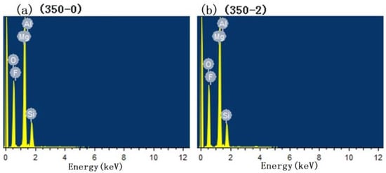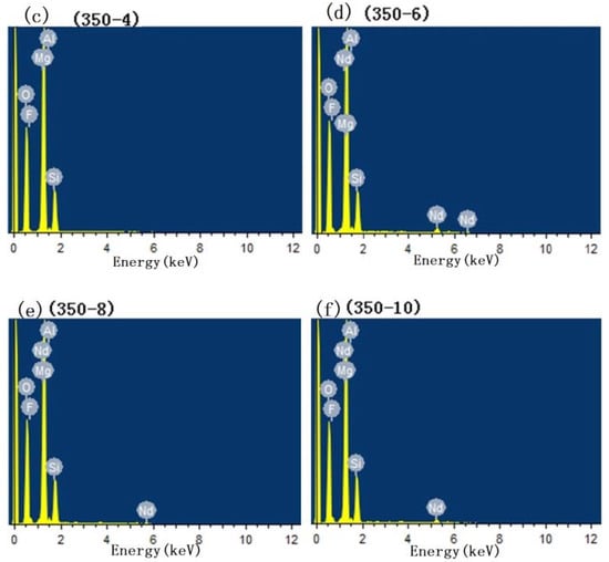 Figure 4 shows the test result of EDS, and the scanning area is in Figure 1. The element content results are shown in Table 2. The results of EDS showed that the main elements of the coatings were Mg, O, F, Si, Al, and Nd. The content of Mg in the coatings gradually decreased with the increase in the concentration of pretreatment Nd(NO3)3 solution. The content of F and Si increased gradually. This showed that pretreatment with Nd(NO3)3 solution could obviously increase the reaction between the electrolyte and magnesium alloy, and make the elements in the electrolyte enter into the coatings. When the concentration of Nd(NO3)3 solution was less than 0.06 mol/L, the coatings contained almost no Nd element, which may be due to the low content of Nd element in the film, which cannot be detected. The (350–6) owned the highest content of Nd, when the concentration was higher than 0.06 mol/L. After the PEO process, the content of Nd in the coatings did not increase with the pretreatment concentration of Nd(NO3)3, which may be due to the intense reaction that made Nd elements attached to the magnesium alloy surface fall into the electrolyte, which led to the decrease of the content.