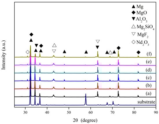 Figure 5 shows the XRD patterns of magnesium alloy substrate and PEO coatings at pretreatment of different concentrations of Nd(NO3)3. It is evident from Figure 5a–f that the coatings were mainly composed of MgO, Al2O3, Mg2SiO4, MgF2, and Nd2O3. The presence of Mg peak corresponding to the Mg alloy substrate could be due to the penetration of X-ray into the substance owing to the thin coatings. This result showed that the Nd element can enter the coatings by pre-treatment and existed in the film as another Nd compound. This coincided with the presence of Nd element in Table 2. The existence of Mg2SiO4 indicated that the main salt component in the electrolyte was involved in the formation of the coatings. The appearance of diffraction peaks corresponding to MgF2 indicated that NaF in the solution participates in the process of plasma electrolytic oxidation, and the presence of Al2O3 in the film in this form indicated that Al2O3 can be deposited into the coatings by means of PEO.