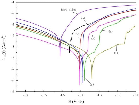 The typical potentiodynamic polarization curves obtained for the substrate and MAO coatings at pretreatment of different concentration of Nd(NO3)3 in 3.5 wt % NaCl solution: (a) 350–0, (b) 350–2, (c) 350–4, (d) 350–6, (e) 350–8, and (f) 350–10.
