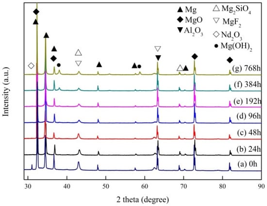 Figure 9 shows the XRD patterns of (350–6) after immersion at different times. The main phases in the coatings changed a little after immersion. It is evident from Figure 9 that the coatings were mainly composed of MgO, Mg2SiO4, Al2O3, and MgF2. The peak of Nd2O3 was lost after immersion in the NaCl solution. After immersion for 384 h, the appearance of the peak of Mg(OH)2 in the coatings may demonstrate the corrosion product Mg(OH)2 produced by the reaction of magnesium with water. MgO reacts slowly with water, and the resulting Mg(OH)2 solids fall into the corrosion solution, so there were no Mg(OH)2 peaks detected prior to this. The peak areas of Mg2SiO4, Al2O3, and MgF2 exhibit a decrease, and the peak area of Mg increases with the increase in immersion time. This indicates that the film is becoming thinner and thinner, and the magnesium is being exposed step by step.