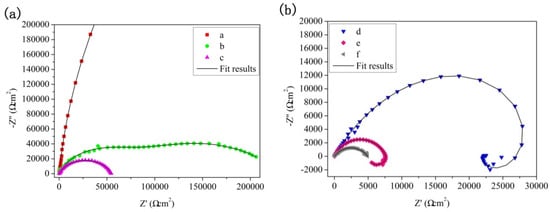 Figure 10 shows EIS plots and fitting results of the PEO immersion coatings carried out in 3.5 wt % NaCl solution. The corrosion rate was different owing to the greater radius of the capacitive loop [33,34]; the larger the radius of the capacitive loop, the lower the corrosion rate of the coating. It can be seen from Figure 10a that the coating exhibited high total impedance at the beginning of immersion, which indicated that the coating owned high corrosion resistance. Figure 10d is characterized by a capacitive loop in high and medium frequency ranges, and an inductive loop in the low frequency range, which was similar to the previous reports [35,36]. The appearance of capacitive loop is owing to the charge transfer process, whereas the inductive loop is related to the dissolution of Mg and is indicative of pitting corrosion of the substrate [37,38]. It can be seen from Figure 10a that during the initial immersion process, the capacitance loop shrinks rapidly, and the initial corrosion was mainly concentrated in the outer layer of the coating. With the immersion time increasing to 192 h, the low frequency inductive loop appeared. It was found in Figure 7e that obvious cracks appeared on the coating surface after immersion for 384 h, which indicated that the corrosion medium had reached the substrate through the crack.