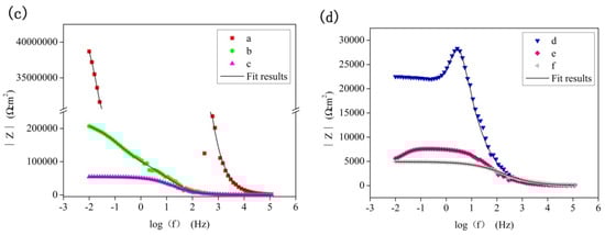 Electrochemical impedance spectroscopy (EIS) plots and fitting results of the MAO immersion coatings carried out in 3.5 wt % NaCl solution: (a,b) Nyquist plot, (c,d) Bode plot of Z vs. frequency. (a) 24 h, (b) 48 h, (c) 96 h, (d) 192 h, (e) 384 h, and (f) 768 h.