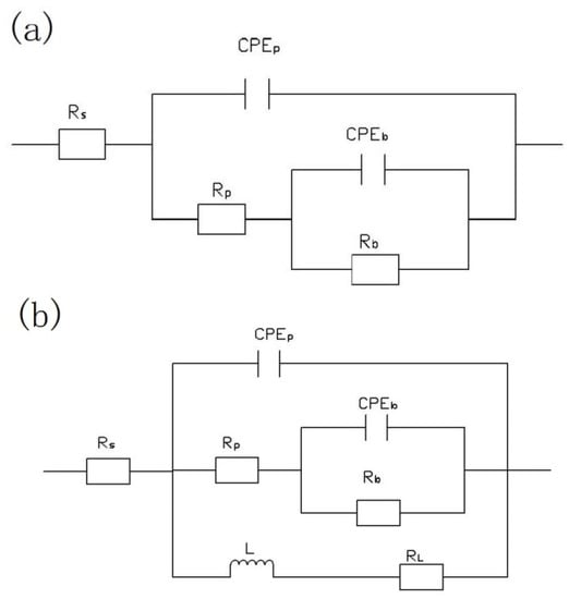 The equivalent circuits of the EIS plots at different immersion times are shown in Figure 11. In the models, Rp/Qp and Rb/Qb are the resistance and constant phase elements of the outer layer and inner layer of the PEO coatings, respectively. R and the corresponding Q are parallel to each other. The constant phase element Q, a constant phase element (CPE), is used instead of a capacitor to compensate the non-homogeneity to obtain the best fit [28,39]. Further, n is a CPE exponent that provides a measure of the unevenness of the electrode surface; when n is equal to 1, the CPE behaves as an ideal capacitor. The corresponding equivalent circuit data are shown in Table 4. From Table 4, it can be concluded that in the early stage of soaking, the Rp of the coating was higher, reaching 1.16 × 106 Ωcm2, and the resistance of the barrier layer was 1.18 × 107 Ωcm2. At this time, the corrosion resistance of the film mainly depends on the corrosion resistance of the dense layer [40,41]. This indicated that the inner dense layer of (350–6) coating plays an important role in the corrosion resistance. The values of Rp and Rb exhibit a decrease with the increase in immersion time, which indicated that the corrosion solution entered the coating through the pores, resulting in the destruction of the inner dense layer of the coating. The value of the inner layer resistance Rp decreased continuously with the further increase in soaking time (192–768 h), which was caused by the corrosion medium entering into the inner layer of the coating and gradually eroding the dense layer. Figure 11b was used to fit the electrochemical corrosion of the coatings in this stage. At this stage, RL represents the charge transfer resistance of pitting corrosion with the inductance L [29].