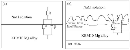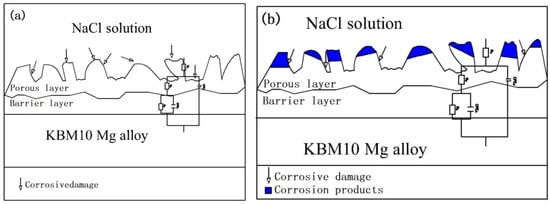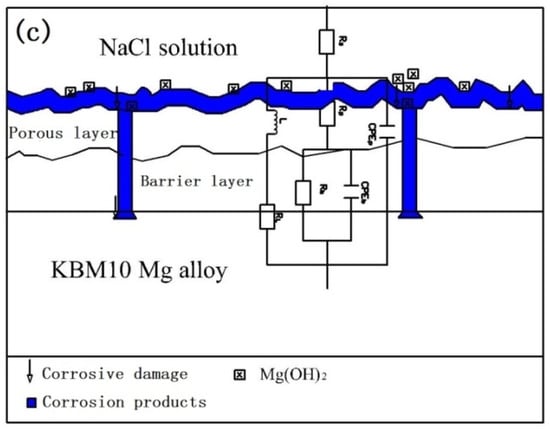 On the basis of the above experiments, the model of degradation was established such as Figure 12 and Figure 13. Figure 12a is the model of KBM10 magnesium alloy substrate. Figure 12b is the model of (350–6) PEO coating. After pretreatment, the thickness of the PEO coating increased, and the substrate was effectively isolated from the outside phase. (350–6) PEO coating included into porous layer and inner dense layer, and the dense layer played a major role in corrosion resistance. During the initial stage of soaking (Figure 13a), the film remains intact and largely undamaged. At the immersed middle stage (48 h, 96 h), the corrosion medium entered the interior of the coating through the pores on the coating. Nd2O3 on the surface of the film was corroded into the corrosion solution, and the MgO in the film layer participates in the reaction MgO + H2O = Mg(OH)2. In Figure 13b, the thickness of the coating decreased, and the corrosion medium gradually entered the coating through the pores. When the immersion time was increased to 192–768 h (Figure 13c), the corrosion of the film surface and its interior were corroded. The corrosion product Mg(OH)2 was deposited onto the surface of the coating gradually. The resistance of the porous layer increased (Table 4). At this stage, the corrosion medium was immersed on the substrate surface through the corrosion channel; the substrate will be destroyed, and the film will gradually relinquish the function of protecting the substrate.