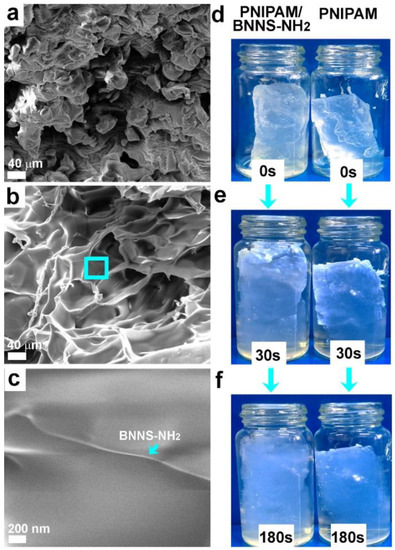 SEM images of the lyophilized hydrogels (a) PNIPAM, (b) PNIPAM/BNNS-NH2, and (c) magnification at cross-section in (b). Photographs of the hydrogels placed in hot water (42 °C) (the left one is PNIPAM/BNNS-NH2, the right one is pure PNIPAM): (d) before poured into hot water, (e) 30 s later and (f) 180 s later placed in hot water (42 °C).