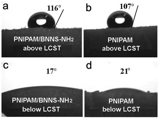 The pictures of contact angle: (a) PNIPAM/BNNS-NH2; (b) PNIPAM at above LCST; (c) PNIPAM/BNNS-NH2 and (d) PNIPAM at below LCST.