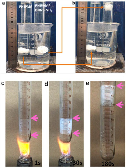 Digital photographs of hydrogels under heating: (a) at the beginning of heating, (b) heating for 10 min by a spirit lamp, PNIPAM/BNNS-NH2 hydrogels were heated for (c) 1 s, (d) 30 s and (e) 180 s from room temperature.
