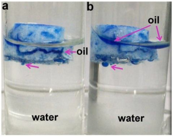 Significantly, the PNIPAM/BNNS-NH2 hydrogels with enhanced thermo-responsive property can also be used to absorb and release oleophilic molecules such as diesel by simply adjusting the temperatures. The absorption capacity for diesel is 3.7 g/g at temperature above LCST, comparable to most polymeric oil-absorbents [30,31]. As shown in Figure 5 the absorbed diesel (dyed by blue colorant) can be effectively released when the temperature was lower than LCST. The hydrophilic-lipophilic properties of the fabricated hydrogels at above and below LCST lead to the design of smart sorbents from the thermo-responsive hydrogels.