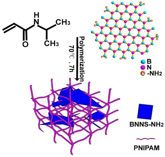 The N-isopropylacrylamide (NIPAM), amino functionalized boron nitride nanosheet (BNNS-NH2) are used as reactants, the N,N′-methylenebisacrylamide (BIS) and the azobisisobutyronitrile (AIBN) are used as crosslinking agent and initiator respectively. The NIPAM, BIS and AIBN were purchased from Sigma-Aldrich (Saint Louis, MO, USA). The BNNS-NH2 was prepared by our previous work [14,29].
