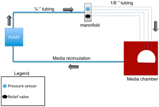 Bioreactors for tissue engineering are still in the early stages of development. A tissue engineering bioreactor must: (1) have even cell distribution throughout the scaffold; (2) satisfy physiologically-relevant factors (like nutrients, oxygen, pH, removal of waste, temperature, and humidity) that is needed by the tissue [17]; (3) aid in the mass transport of medium throughout the scaffold; and (4) integrate required physical parameters (like the flow rate of the blood within bone, pressure, fluid shear stress, resistance, and compliance). The bioreactor should also be effortlessly monitored, controlled, and sterile, in addition to the results being reproducible [1]. Our perfusion bioreactor was designed to address these parameters. Silicone tubing was used throughout the system because it is a commonly used biomaterial in implants, biocompatible, and can be autoclaved at 121 °C for 15 min [18]. A manifold was designed using stainless steel because previous studies have shown that long-term use does not increase toxicity [17]. Within the manifold there were a pressure gauge and pressure relief valve. These were used to adjust the pressure levels if it was outside the normal, physiological range of 0.1–1.1 psi [19,20]. Syringe needles (21 ½ gauge) were used to cannulate the bone, because their width (0.5 mm) matched the inner diameter of four main arteries (0.5–8.5 mm).