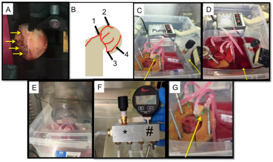 Sample bioreactor design: (A) An image of a human femoral head before cannulation and perfusion. The yellow arrows indicate were the perfusion would be attempted. (B) A schematic depicting the location of the possible vasculature that was cannulated during perfusion. (1) Lateral cervical ascending artery; (2) posterior superior branch; (3) medial circumflex femoral artery; and (4) posterior inferior branch. (C) The bioreactor and all its components, yellow arrows indicate the manifold and the pressure gauge and relief valve. This image was taken prior to completely filling the media chamber with DMEM. (D) The bioreactor and all its components. Once the bone is cannulated, the media chamber is filled (designated with a yellow arrow). This image was taken after the chamber was filled up completely. (E) The closed system bioreactor. Once the set-up was complete, a lid was placed on the bioreactor system and it was transferred into an incubator, where it remained for the duration of the perfusion experiment. (F) Modified manifold design showing the pressure gauge (#) and pressure relief valve (*) which allow continuous monitoring of pressure. (G) An enlarged image of the femoral head holder, the arrow demoting one of the four needles cannulating the femoral head.