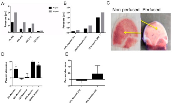 Human femoral heads contain several cell types in their native environment, including the vasculature. Therefore, they serve as an ideal test system to study the interaction of potential therapeutics with cells. The drugs can be perfused through the vasculature. However, one drawback is that cells start dying within the bone within 12–24 h after removal from the patients [9]. In order to keep the cells viable, nutrients need to be delivered to them through the vasculature. The blood flow through the vasculature maintains a pressure range of 0.1–1.1 psi [2,10]. In addition long-term storage for 12 h of the femoral heads results in blood coagulation, which causes perfusion pressure to increase. To address this, mannitol and heparin, pressure-relieving agents, were used with bovine femoral heads in order to perfect the parameters of the perfusion bioreactor, before utilizing human femoral heads from patients. Heparin is a known anticoagulant and mannitol has been shown to improve osmotic regulation in perfusion bioreactors [11,12]. To determine the efficacy of mannitol and heparin on pressure, prior to perfusion the femoral head was soaked at different time points (one or two hours) and at different concentrations of either mannitol (5%, 10%, 15%) or heparin (0.15% and 0.0025%). The time points were initially selected due to heparin’s fast-acting anticoagulant ability. Heparin has been shown to act quickly in the clinic time and time again, which is why it is the preferred method in hospitals and ERs today [13]. Initial and final pressure readings were compared for all time points and varying concentrations (Figure 3A,B). Heparin-treated samples showed an increase in pressure within the femoral head, however, it can be noted that the femoral head was noticeably softer and more brittle after the two-hour heparin soak. Mannitol increased cannulation efficiency and decreased the pressure. The two-hour, 10% mannitol soak yielded the lowest change in pressure (0.1 psi) and also maintained the normal, physiological pressure of blood within the femoral head (0.1 to 1.1 psi); therefore, it was selected.