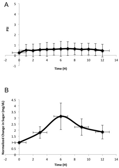 Pressure and sugar changes during 12-h perfusion bioreactor experiments: (A) Change in pressure perfused through the femoral head over 12-h bioreactor runs (n = 3). The pressure remained between physiological levels of 0.1 and 1.1 psi and was measured through a pressure sensor. (B) Sugar readings were taken every three hours for a 12 h period, while the bioreactor was running and femoral heads were being perfused. Sugar readings from the perfusion experiments were subtracted from an averaged glucose reading of the media, without a femoral head. From there, the sugar readings were normalized to the 0-h time point. This is an average of three independent experiments. All error bars represent standard error.