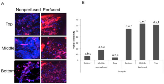 Human femoral heads underwent a 12-h perfusion and were successively cored, sliced, imaged, and analyzed. A control femoral head was also used without any cannulation. It was also sliced and cored in the same manner. Both sets of slices (perfused and non-perfused) were imaged on the Zeiss LSM 880 for live cell imaging, as described in the Methods section. Slices from the top, middle, and lower part of the femoral head were compared for perfusion. Only perfused regions that include live cells will stain. Figure 5A shows live cell imaging of both the perfused and non-perfused femoral head sliced cores. The red stain seen is the Calcein red-orange, indicating live, viable cells. The blue stain seen is a nuclear Hoechst stain, which stains the nucleus of both live and dead cells. The images seen in Figure 5A are a 3D rendering of the bone slices. The slices were taken from the top, middle, and bottom portions of the femoral head. In Figure 5B, the intensity of the stains were quantified in ImageJ and normalized in order to determine if a greater amount of Calcein red-orange stain was observed in the images. This figure indicates that the staining in the perfused slices were significantly different from the non-perfused slices at all levels of the core. These data indicate that vascular perfusion of human femoral heads is much greater than diffusion and the viability of cells was maintained ex vivo. Additionally, it shows that the media is perfused throughout the whole femoral head.