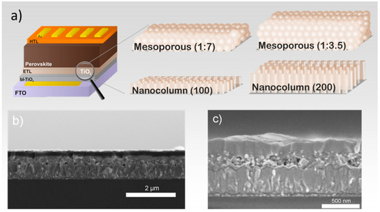 (a) Cross-sectional device scheme and electron selective layer (ESL) used, (b) scanning electron microscopy (SEM) image of PSC with 1:7 TiO2 mesoporous structure and (c) SEM image of PSC with 1:3.5 TiO2 mesoporous structure.
