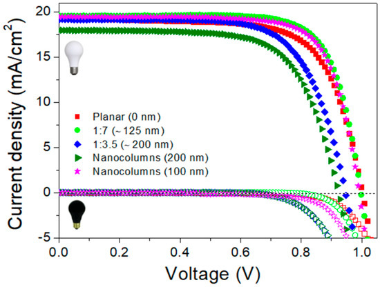 A lower value of Voc was noted (Voc = 930 mV) with a thicker TiO2 layer (nanocolumns-200 nm and nanoparticles-1:3.5), in comparison to the thinner TiO2 ESLs (nanocolumns-100 nm and nanoparticles-1:7), or planar devices (0 nm). Although no significant changes were observed in terms of the Jsc, and regardless of the nanostructure and thickness of the ESLs, all devices gave Jsc in the range of 18–19 mA·cm−2. These results are in line with the absorbance spectra obtained for the different configuration (Figure S2). Devices fabricated with mesoporous layer (1:7, Ø30 nm) and 100 nm nanocolumns yielded best PCE, as well as lower series resistance (Figure S1).