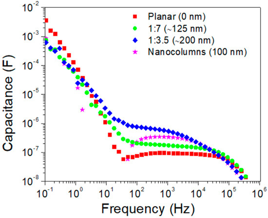 Figure 3 shows the apparent capacitance versus frequency plots, illustrating the different processes depending on the range of frequency. Low-frequency processes could be related to hysteresis behavior and thus we studied the variation of the low-frequency capacitance as a function of photo-voltage (Figure S3). The value of slope (V−1) close to 22 indicates the existence of an accumulation regime. Our results suggest that planar configuration presents a higher slope than non-planar-based structure, suggesting a possible higher charge accumulation at the interface.