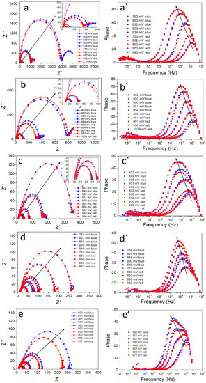 Nyquist (a–e) and Bode plots (a`–e`) at different applied voltages for CH3NH3PbI3 perovskite solar cells using two excitation wavelengths, λblue = 465 nm and λred = 635 nm. Different configurations are labeled as follows: (a,a`) planar, (b,b`) mesoporous 1:7, (c,c`) mesoporous 1:3.5, (d,d`) nanocolumns 100 nm and (e,e`) nanocolumns 200 nm. Arrows indicate the evolution of the measurements when we measured from VOC to lower values.