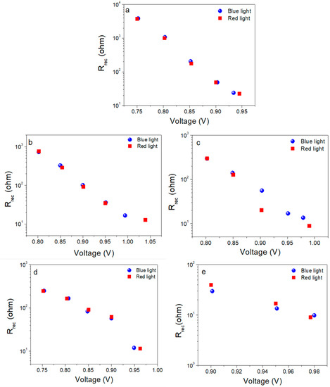 Recombination resistance plots (a–e) at different applied voltages for CH3NH3PbI3 perovskite using the two excitation wavelengths, λblue = 465 nm and λred = 635 nm. Different configurations are labeled as follows: (a) planar, (b) mesoporous 1:7, (c) mesoporous 1:3.5, (d) nanocolumns 100 nm and (e) nanocolumns 200 nm.