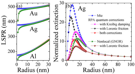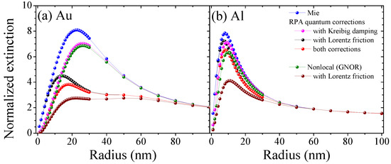 We compare the quantum correction models introduced in the previous section, see Figure 1, as well as the combined effect of Kreibig damping Equation (1b), Lorentz friction Equation (1d) and spatial dispersion to classical Mie calculations for the materials gold, aluminum and silver in Figure 2 and Figure 3. Hereby, we show the effect on the Localized Surface Plasmon Resonance (LSPR) for all materials in Figure 2a, confirming that the modified damping rates do not alter the resonance position predicted by the classical calculations, whereas nonlocal response—and in combination with any damping model—does predict an increasing blueshift of the nanoparticle resonance with decreasing particle size. Looking at the extinction cross section as a function of particle radius in Figure 2b for silver and Figure 3 for gold and aluminum, we find that all correction models result in a reduction of the optical response in dependence of both the material and particle size, typically yielding a different optimized particle size. Hereby, Kreibig damping with a ∼ dependence drastically attenuates the optical response for the smaller size regime below the maxima (15 nm for Ag, 20 nm for Au, and 10 nm for Al), while the complex size dependence of Lorentz friction results in a greater effect above this particle size. The diffusion coefficient in the hydrodynamic (GNOR) model (imaginary part of the nonlocal parameter ) is chosen thus that its dampening effect captures the Kreibig result [56]. This is best seen in Figure 3a for Au. The hydrodynamic pressure (real part of the nonlocal parameter ) describes Coulomb interaction between electrons and results in the blueshift observed in Figure 2a at very small particle sizes below 5 nm. We can further incorporate the analytical expressions for Lorentz friction. This combined result shows the strongest attenuation since all different damping channels are included. At a larger particle size (60 nm for Ag, 80 nm for Au, and 40 nm for Al) all material models converge with classical Mie theory where the mesoscale electron dynamics cease to have an impact.