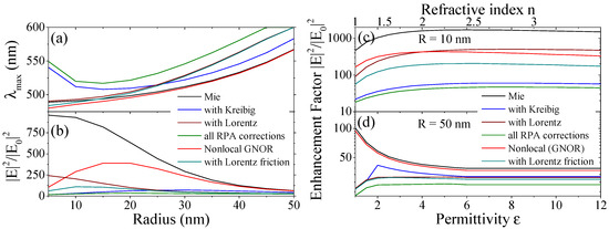 Figure 4c,d shows the (maximum) field enhancement of gold nanoparticles in dependence of the refractive index (RI) of the surrounding medium (from air to Si ) for two particle sizes. This is accompanied with a linear (in case of the nonlocal theory approximately linear) shift in the resonance wavelength towards longer wavelengths (not shown). With increasing RI of the host medium, the enhancement factor reaches a saturation value which for increasing particle size converges for all material models discussed. The discrepancy between the local field enhancement values predicted remains similar for small MNPs in different host media spanning several orders of magnitude.