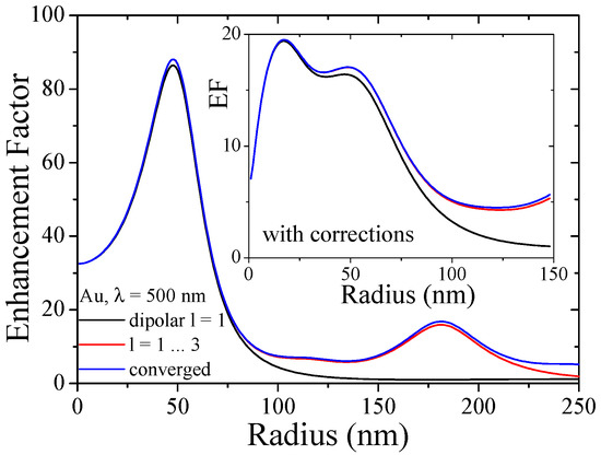 Size regime for multipolar response in metal nanoparticles. Enhancement factor at the particle surface, where the EF is maximized, for nm close to the corresponding Mie resonance of gold with classical Mie coefficients and as inset with combined microscopic corrections. The calculations are based on the dipolar response (black), the first three multipoles (red) and the converged result (blue).