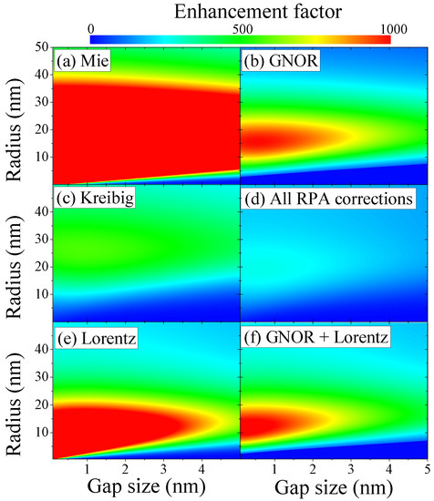 Lorentz friction is closest to the classical calculation for smaller sizes and deviates stronger at larger sizes. This is in agreement with the findings of Figure 2 and Figure 3. The corresponding field enhancement, shown in Figure 4b for gold MNPs in water, is strongly suppressed for the considered particle size range when including the damping models while spatial dispersion by itself reduces the predicted field enhancement mostly for smaller particle sizes and converges with the classical Mie result rapidly with increasing particle size. This behavior is corrected by incorporating Lorentz friction into the GNOR result.