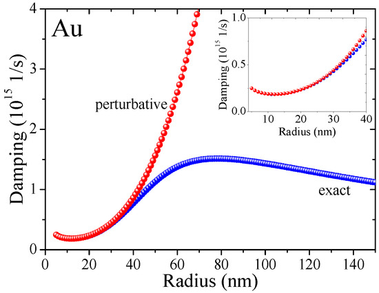 For larger radii, the discrepancy between both solutions grows rapidly since the irradiation losses within the perturbation approach scale as . Therefore, the radiative losses dominate plasmon damping for large nanospheres. On the other hand, scattering is more important for smaller nanospheres scaling as . One can observe thus the size-dependent crossover in Figure 3a of the damping at ca. 12 nm for gold.