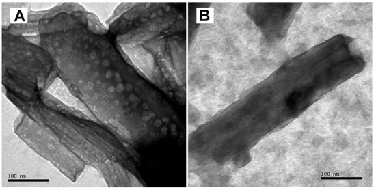 Halloysite nanotubes (Al2Si2O5(OH)4·2H2O) with a diameter of 30–70 nm and length of 1–3 μm (Sigma-Aldrich, St. Louis, MO, USA) were treated with a silane solution (5 wt.% of 3-metacryloxypropyltrimetoxysilane and 95 wt.% acetone) at 110 °C for 24 h. Subsequently, these were mixed [1:1 ratio] with 2,4,4-Trichloro-2-hydroxydiphenyl ether (TCN: Triclosan, Fagron, Rotterdam, SH, The Netherlands) under constant shaking for 1 h [3]. The mixture was then dispersed in 95 wt.% pure ethanol (0.03 mg/mL−1) and ultasonicated for 1 h. The nanoparticles were finally desiccated for 10 days at 30 °C to ensure complete evaporation of the residual solvents. The HNT/TCN nanoparticles obtained after such processing method were finally prepared and characterized using a Transmission Electron Microscope (TEM) JEM 120 Exll (JEOL, Tokyo, Japan) at 80 kV at a magnification X 300,000.