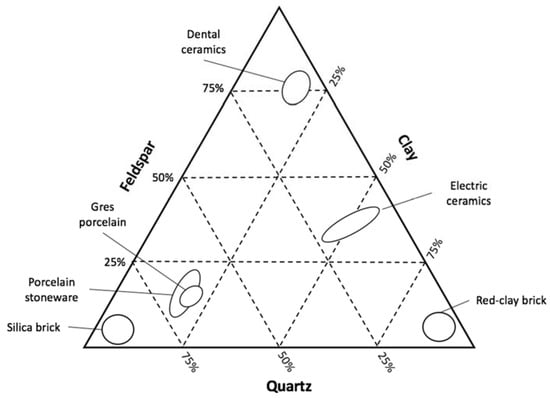 The basic composition of porcelain is made by quartz, feldspar and clay or kaolin. Quartz allows the composite to have high thermal and dimensional stability due to its elevated melting point; the glassy phase at low temperature of feldspar assists the sintering process and reduces the porosity at a very low level (less than 0.5% of open porosity and less than 10% of closed porosity); and clay is responsible for the plasticity and dry mechanical strength before firing, where it develops mullite that by its turn increases the bending strength of the material [6,7]. A general overview of some of the most relevant ceramic compositions can be seen in Figure 1.