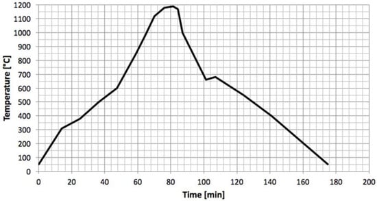 The gres porcelain considered was the FloorTech 1.0 manufactured by Florim Ceramiche S.p.A. (Fiorano Modenese, MO, Italy), being majorly composed of silica (SiO2, 69%), alumina (Al2O3, 21%) and small quantities of the oxides TiO2, Fe2O3, MgO, CaO, Na2O and K2O, according to the gres characterization indicated by other studies [4,20]. The resulting density was 2200 g/mm3. Specimens were separated into two groups: the regular and the annealed ones. Annealing is a thermal treatment destined to eliminate internal stress concentrations derivate from the manufacturing process and to promote/complete chemical reactions towards a thermodynamic equilibrium; its influence was studied in the present work to understand how the properties of gres vary depending on annealing. The thermal cycle (Figure 2) lasted for 3 h, where the ascending ramp rises until 1200 °C under a 15 °C/min rate, and then descends again to room temperature on a slower rate of 12 °C/min.