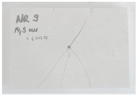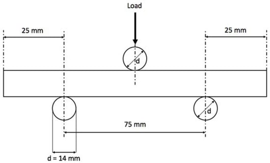 As a common practice for fragile materials, where tension tests become difficult due to load alignment and sample clamping, bending tests are regularly applied to determine the transversal breaking strength. Gres porcelain coupons were cut into the dimensions 100 mm × 20 mm × 9.5 mm and submitted to three-point bending tests as indicated by the regulation ISO 10545-4 [23], which defines the standard process of a force applied at a specific rate in the center of the ceramic tile for determination of modulus of rupture and breaking strength of the material. The specimen was set to a 0.005 mm/s actuator displacement on a universal hydraulic testing machine where the rods were 14 mm in diameter and the distance between the lower rods was 50 mm, as illustrated by Figure 3. A total of 14 coupons were tested to assess statistical significance: 7 for regular and 7 for annealed ceramics.