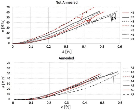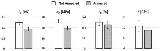 Bending test results are displayed in Table 3 for not annealed and in Table 4 for annealed specimens, where stands for breaking load, for breaking stress, for breaking strain and E for tensile modulus.